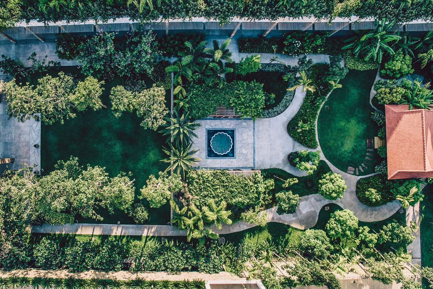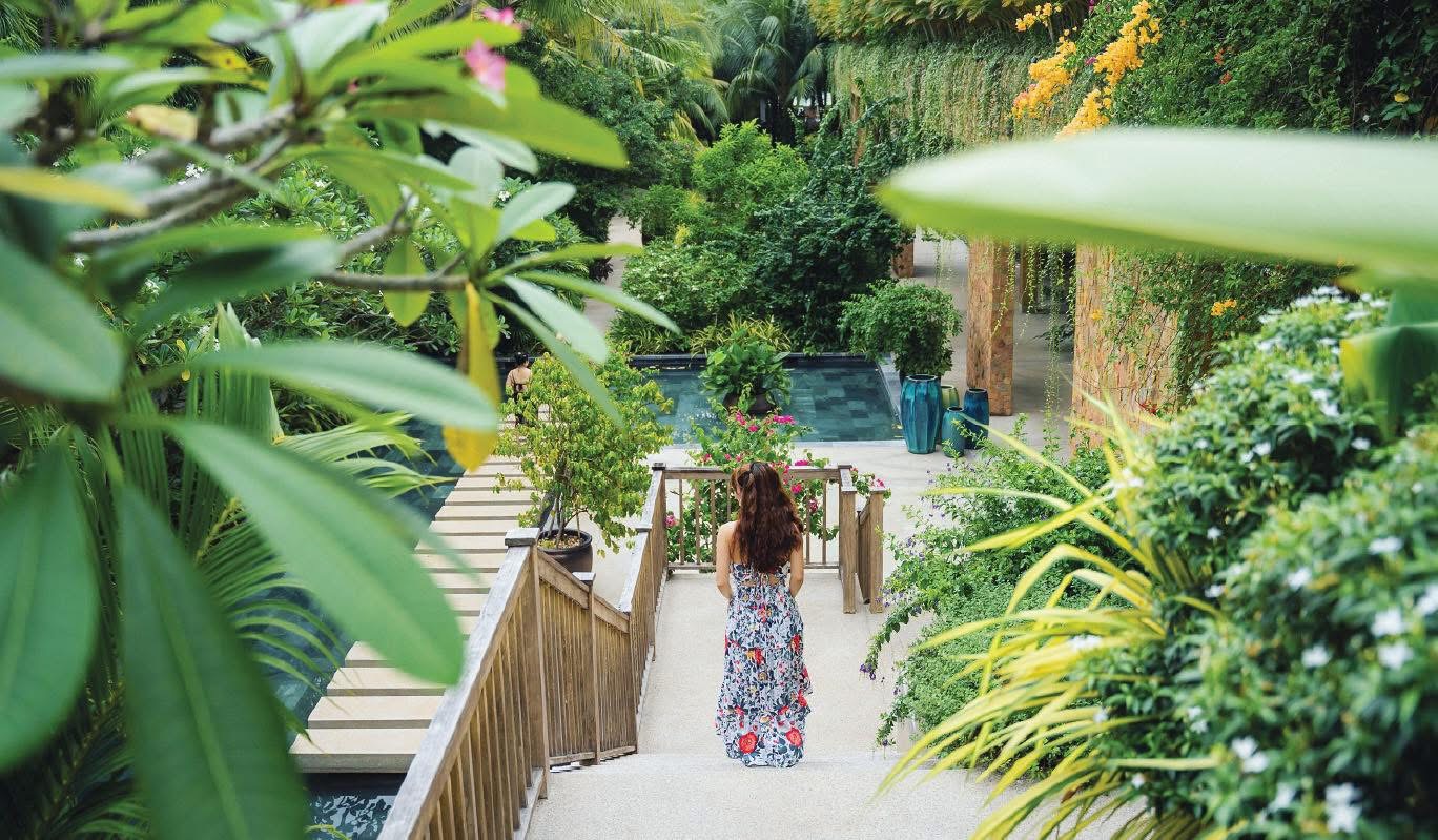 – Khu nghỉ dưỡng được bao bọc trong một chiếc khăn choàng màu xanh lá cây, bao gồm những khu vườn lớn với nhiều loại hoa, cỏ, lá.