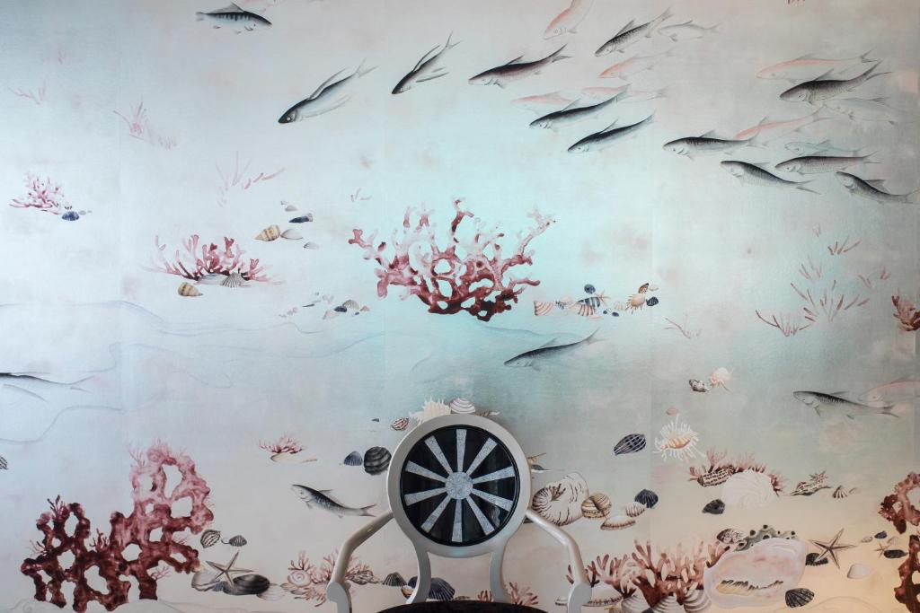 – Bức tranh Đáy đại dương được vẽ trên giấy mạ vàng với lớp hoàn thiện bề mặt là bột ngọc trai, bức tranh giấy dán tường này miêu tả một thế giới đa dạng dưới đáy biển địa phương, được lấy cảm hứng từ thiết kế nổi tiếng mang chủ đề về các loài cá của de Gournay.