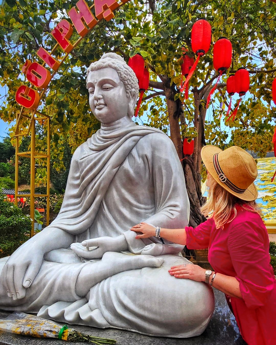 – Khi bước vào trong, bạn sẽ thấy ngay bức tượng Đức Phật bằng đá cẩm thạch, cao gần 3m nằm dưới tán cây bồ đề rợp mát trong sân. Khuôn mặt của Ngài được khắc họa toát lên vẻ hiền từ.