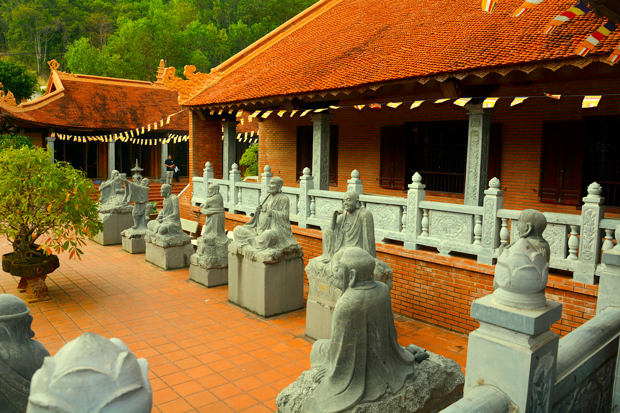 – Bảo hộ quanh Chính điện là bức tượng bằng đá của 18 vị La Hán. Hai bên, mỗi bên có 9 tượng.